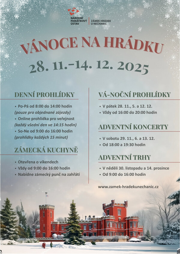Dovolujeme si Vás pozvat na 31. ročník akce Vánoce na Hrádku u Nechanic. Od 28. listopadu do 14. prosince 2025 Vás ve vánočně vyzdobených interiérech seznámíme s historií Vánoc, jejich zvyky a tradicemi.